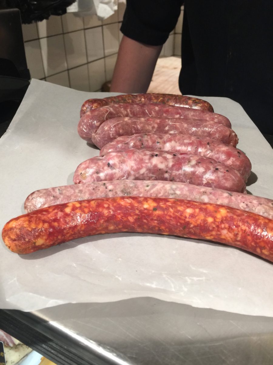 I think most of you probably know about my potato obsession. Well I now have to confess to another; ‘the search for the perfect pork sausage’. My final meal on leaving London was sausage and mash (thanks Karen!). In America I was dismayed to find most sausages were either Italian, sweet or spicy, both containing fennel or made with chicken, chicken ? I finally discovered Wholefoods sold pork Irish bangers. Before they opened a store in Darien I would drive two towns over just to stock up, and I rarely left town otherwise. In all fairness, it is not just me. As a nation, we Brits take our sausages or bangers very seriously. A quick look online will lead to many posts by expats lamenting the lack of a decent banger in their new home. One of my friends, Liz, a real chef and a well travelled soul was so frustrated by never finding a proper banger that she bought all the equipment to make her own. We spent a very happy afternoon in Darien mincing pork and threading it into natural casings.